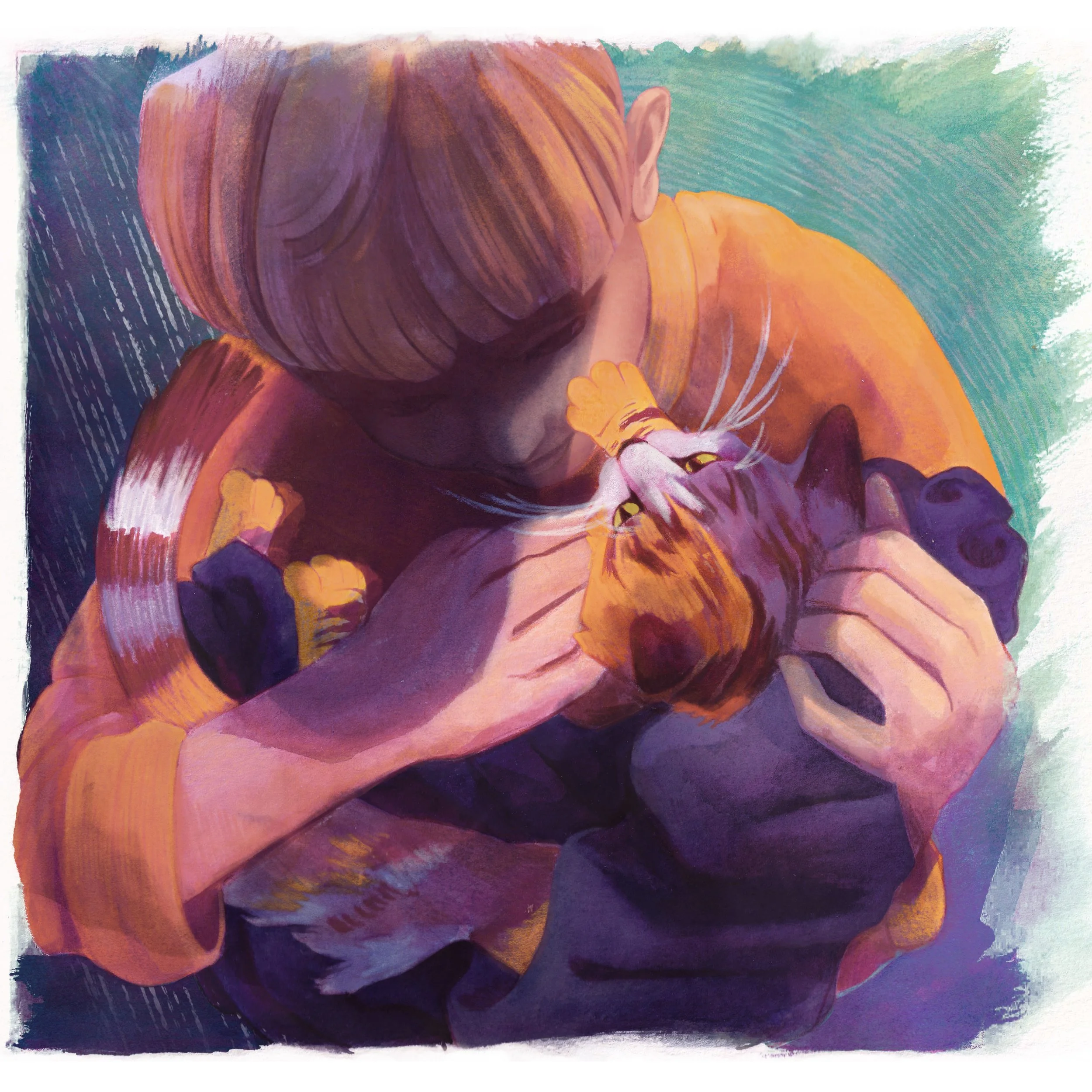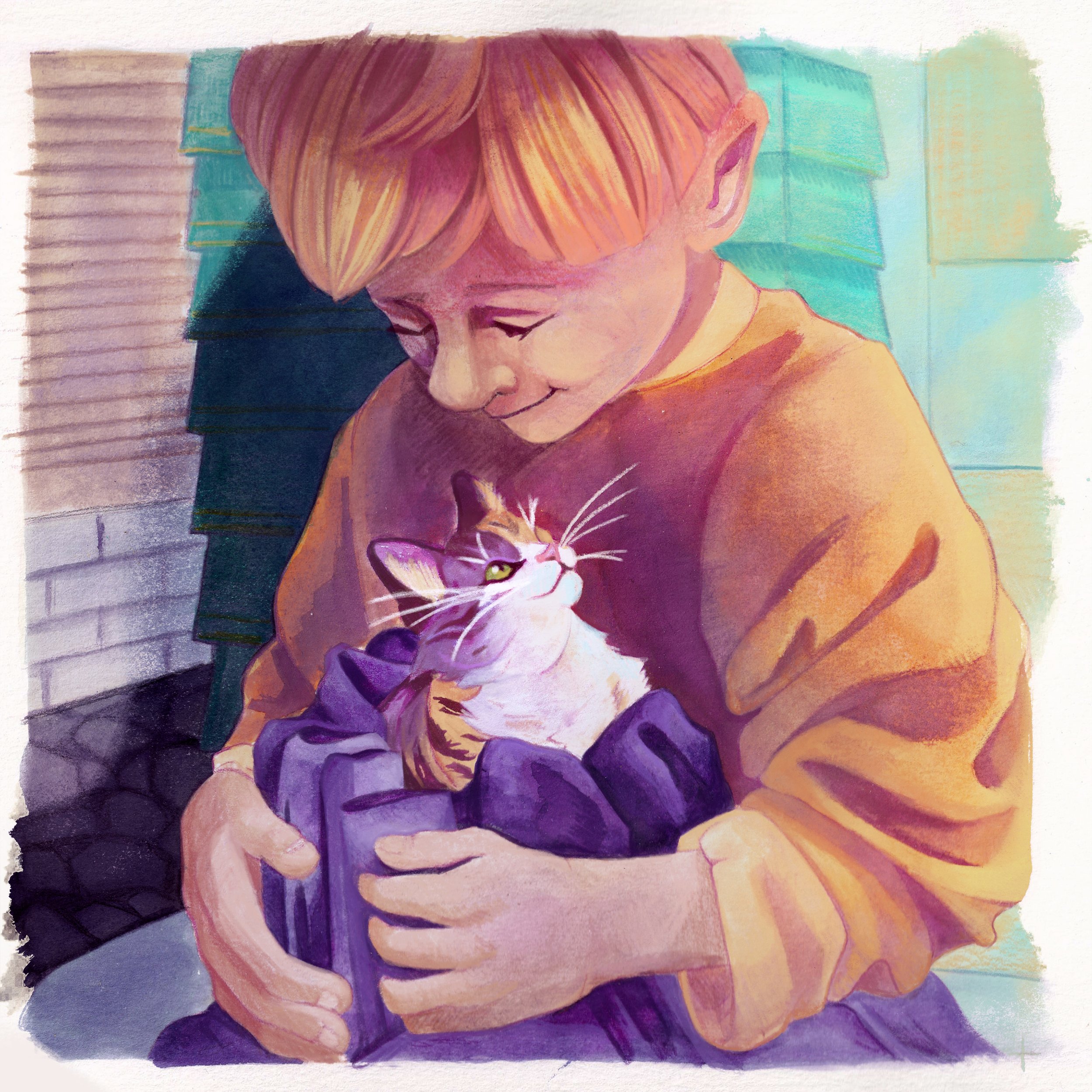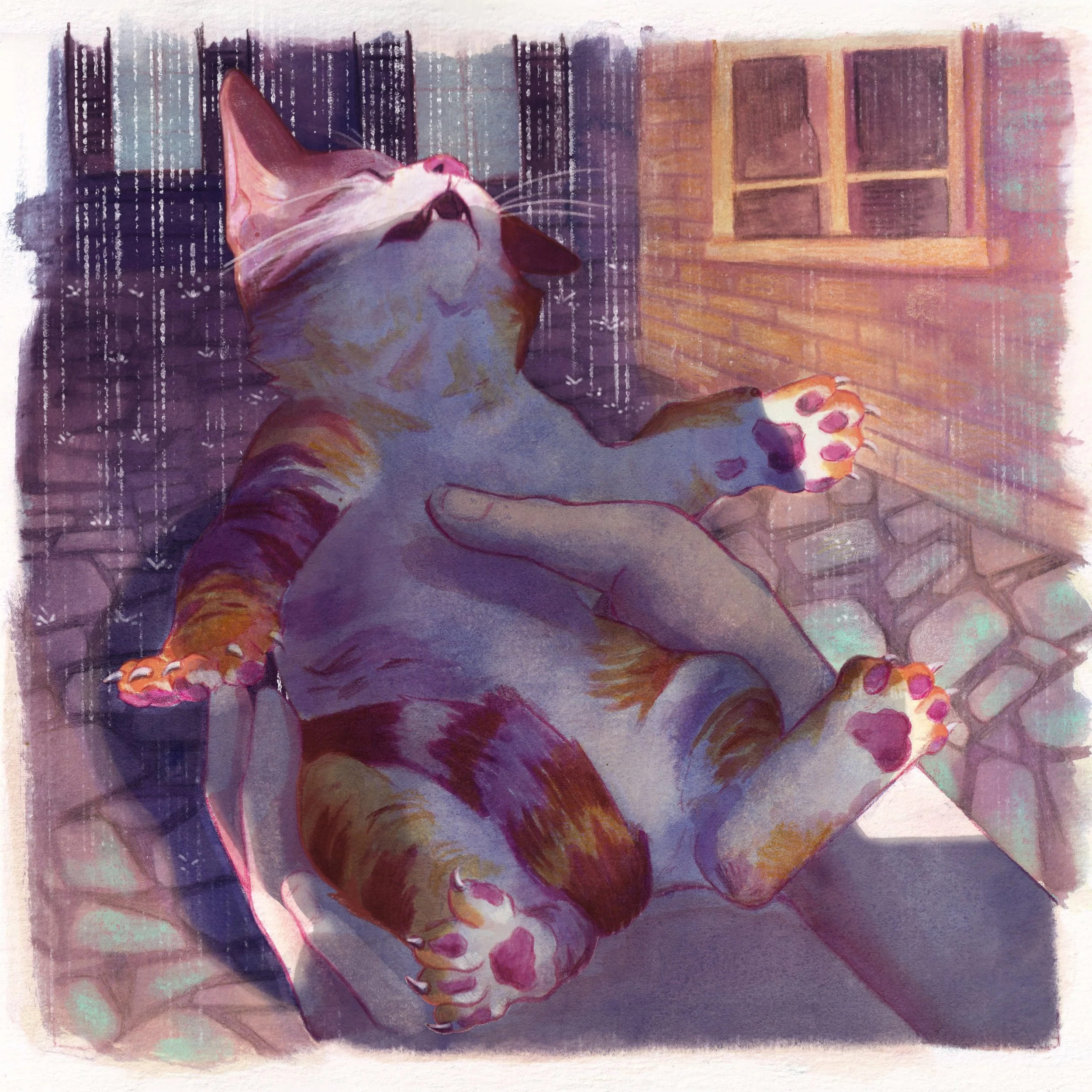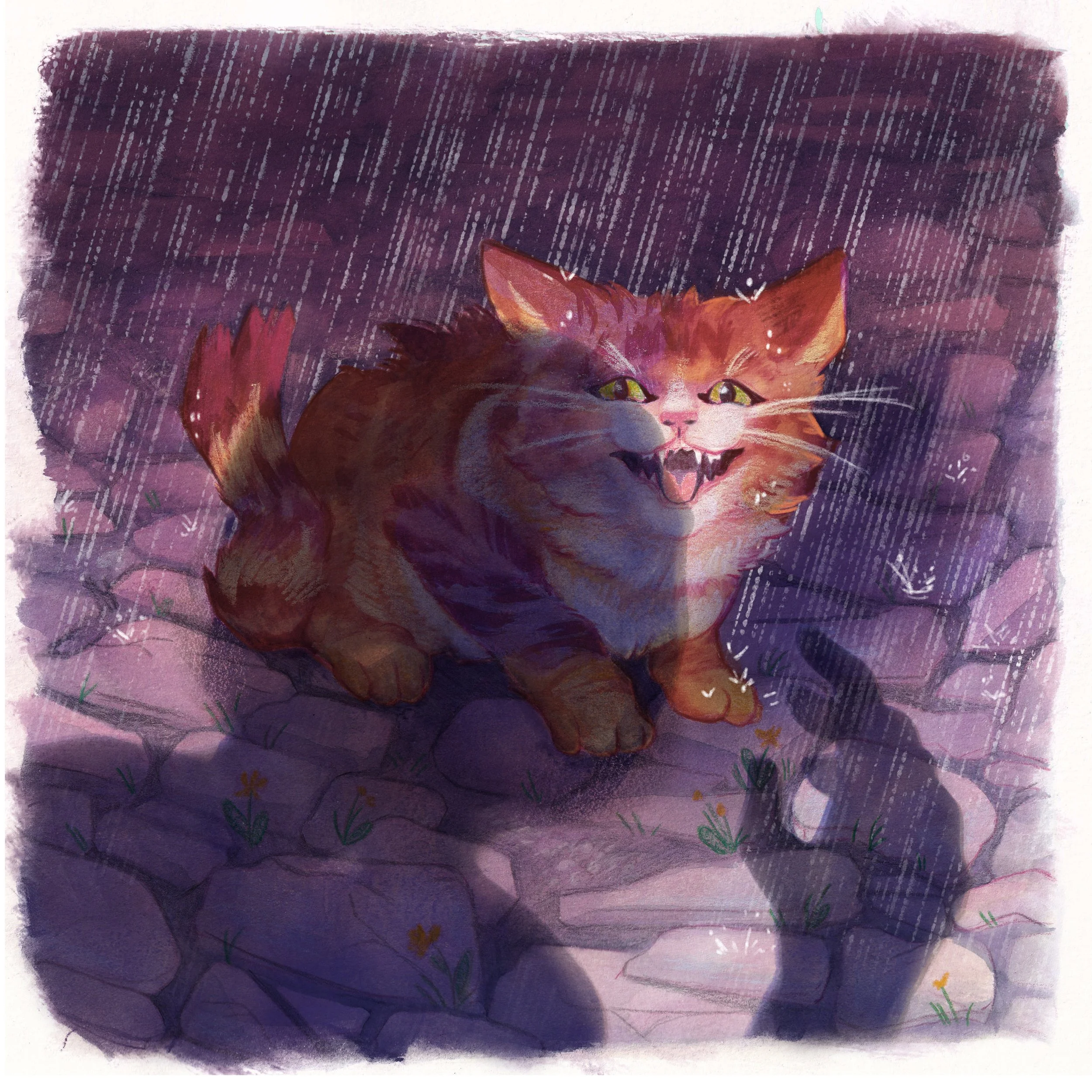 This is a story from the perspective of a lost kitten in the rain. The threat appears to be a scary, looming shadow coming for them, but in the end the shadow is just a new friend trying to help.