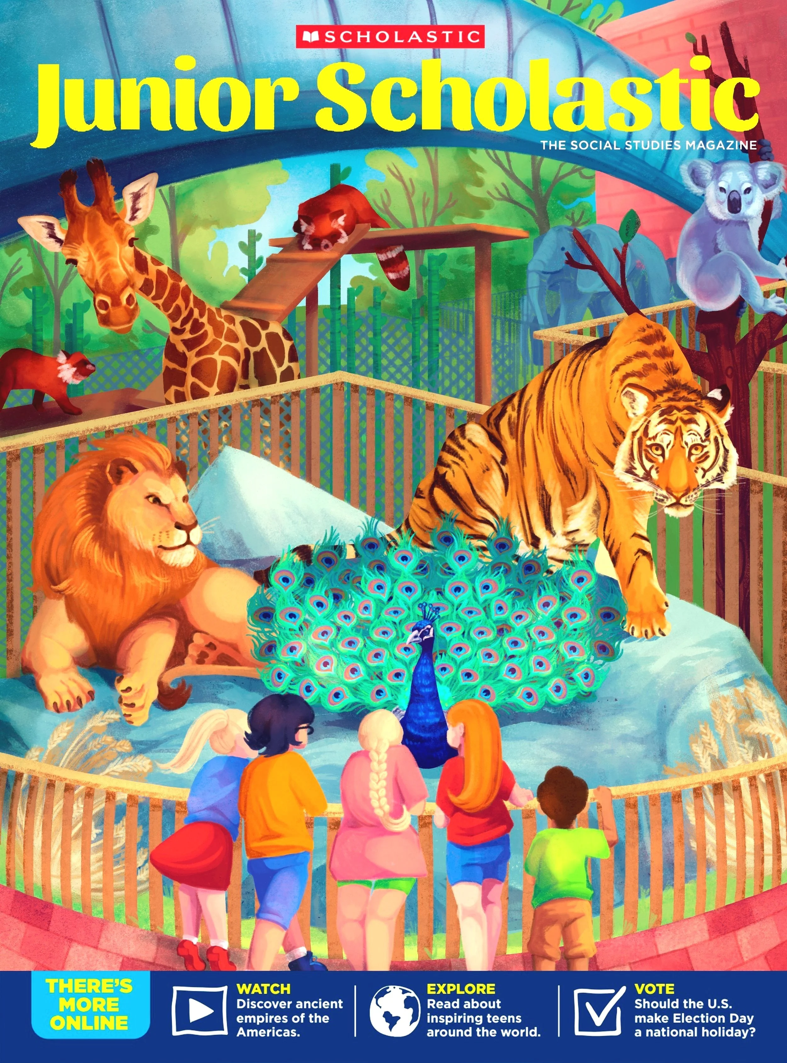 A mock cover illustration inspired by Junior Scholastic’s ‘Debate it’ section. This “Debate it” article discusses the usually fun, but occasionally controversial topic of zoos, and whether or not they should continue to exist. These sections of Junior Scholastic is intended to spark a class discussion so they equally present both sides of the zoo argument.